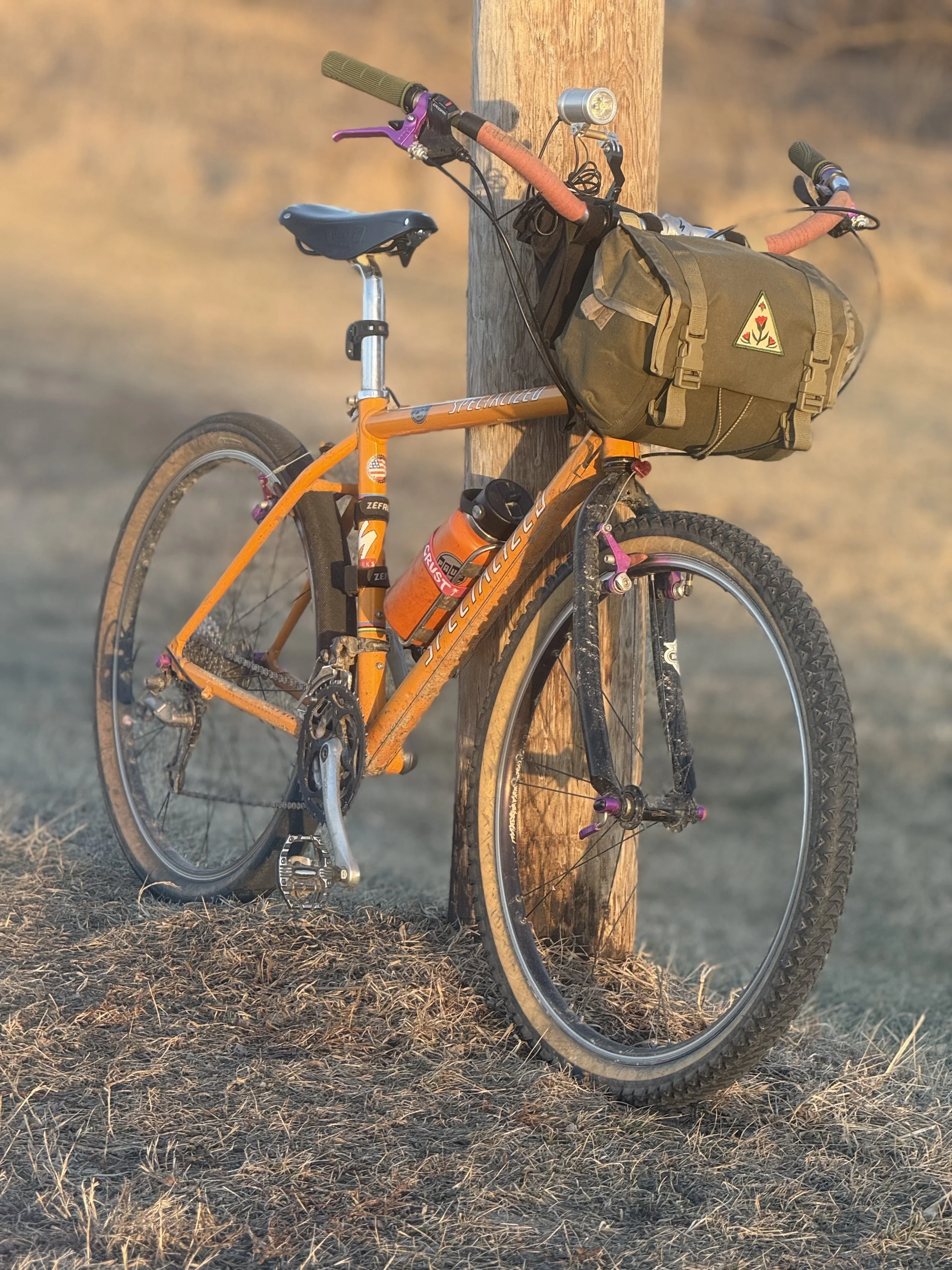 This Specialized is an iteration from Ron Ultraromance who during Covid shutdown experimented with these frames and prepped a couple of them up for some ATB-ing style of riding. These frames are very light being that these are aluminum, and like Ronnie Romance says, “…tires aired to educated lower pressures make the difference of a comfortable ride versus a ride that will rattle your teeth out, when it comes to aluminum.” (May be a bit off on the wording) but its true, these bikes are so nimble and easy to portage when riding in single-track and you have to walk sections because the trail ran out or a tree or several trees are in the way. While I still love touring on a steel bike, these aluminum bikes, make for perfect local long day jaunts.
